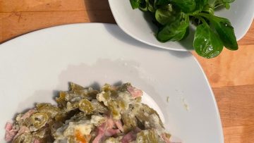 Diese Schinkennudeln schmecken phantastisch. Man merkt nicht, dass es sich hier um Erbsennudeln handelt. Schön dabei ist die Extra-Portion Protein aus den Nudeln.